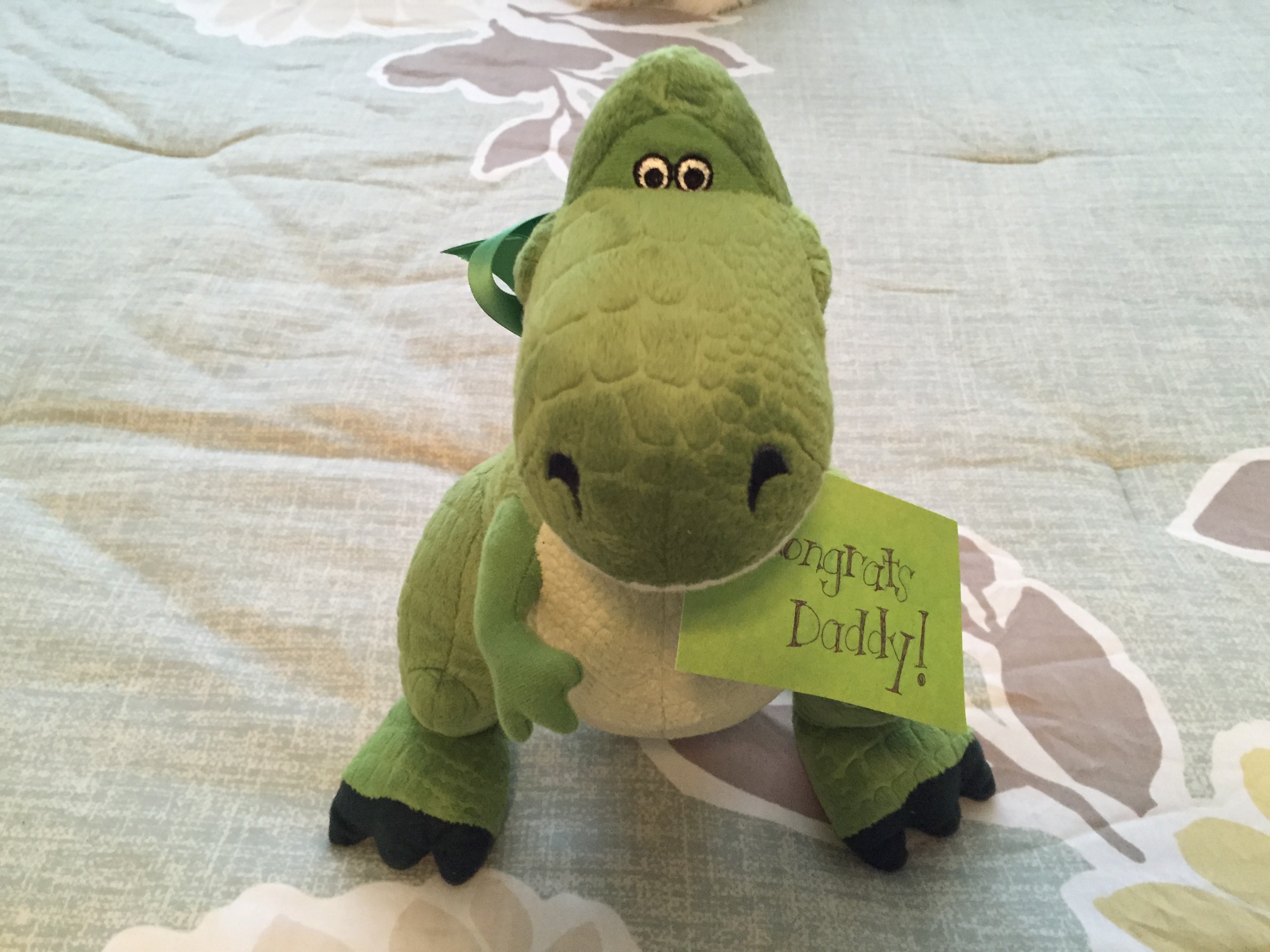 With the stuffed Rex in his hands, I waited for his reaction. At first there was none. I watched as he read the little note, and I watched as he continued to stare at the toy. I assume that I watched him for only a few seconds, but it felt like minutes. Then he looked up, clearly still confused by the note. And then the question, “Wait, are you pregnant?”